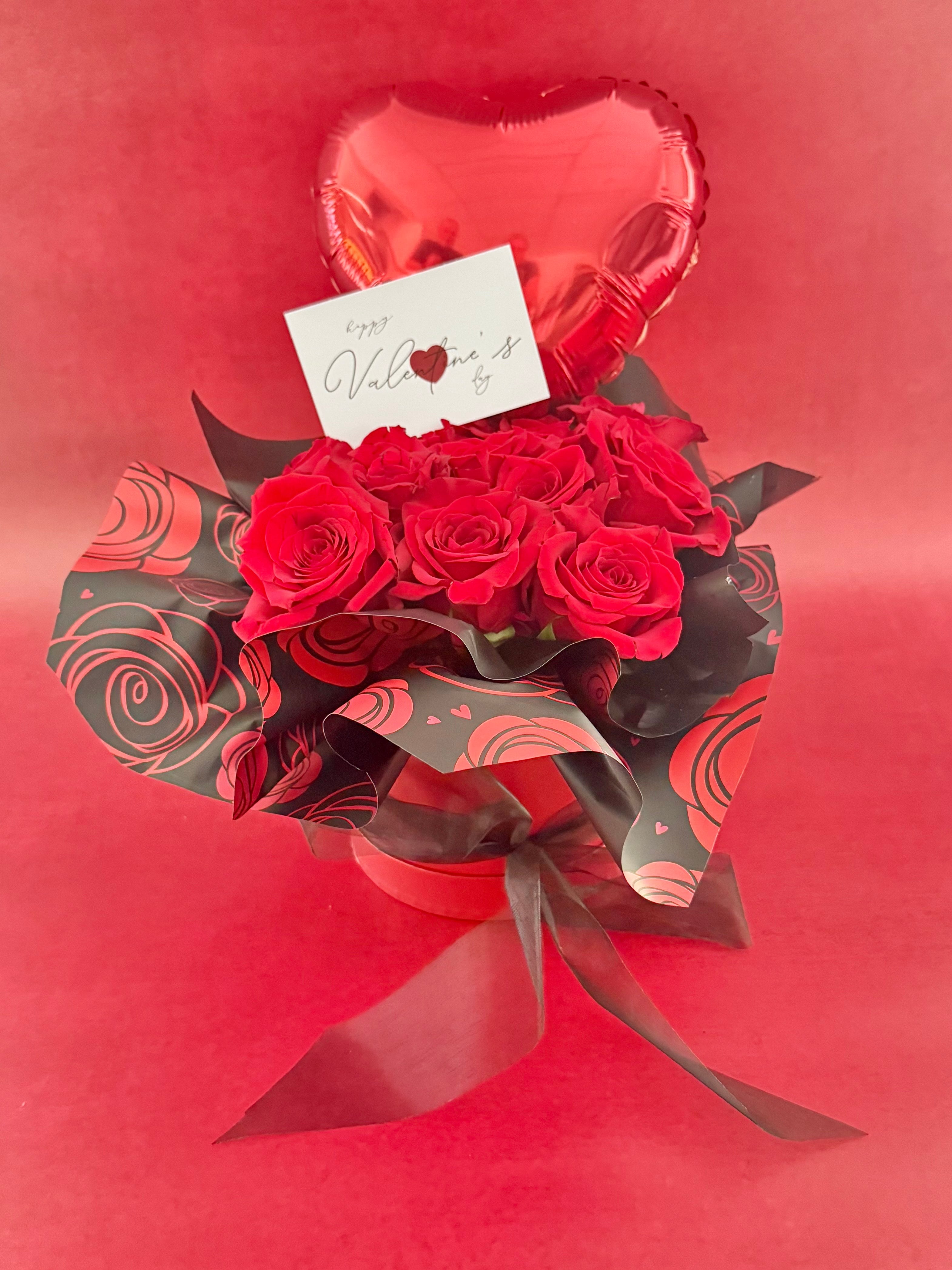 Perfect for Valentine's Day, this beautifully packaged hat box containing 12 premium roses comes in your choice of passionate Red, vibrant Hot Pink, or delicate Soft Pink Roses and a love heart Valentines balloon.