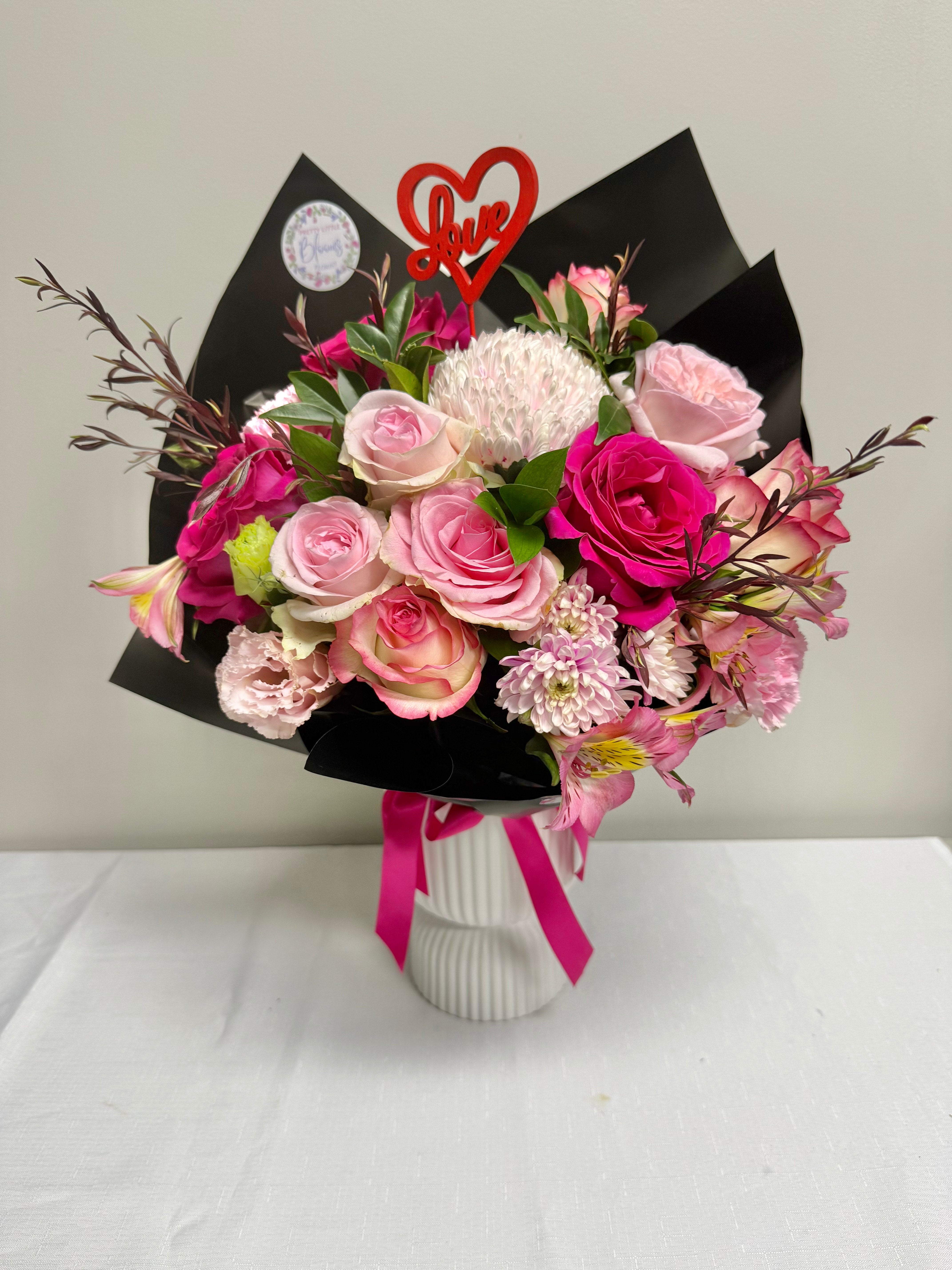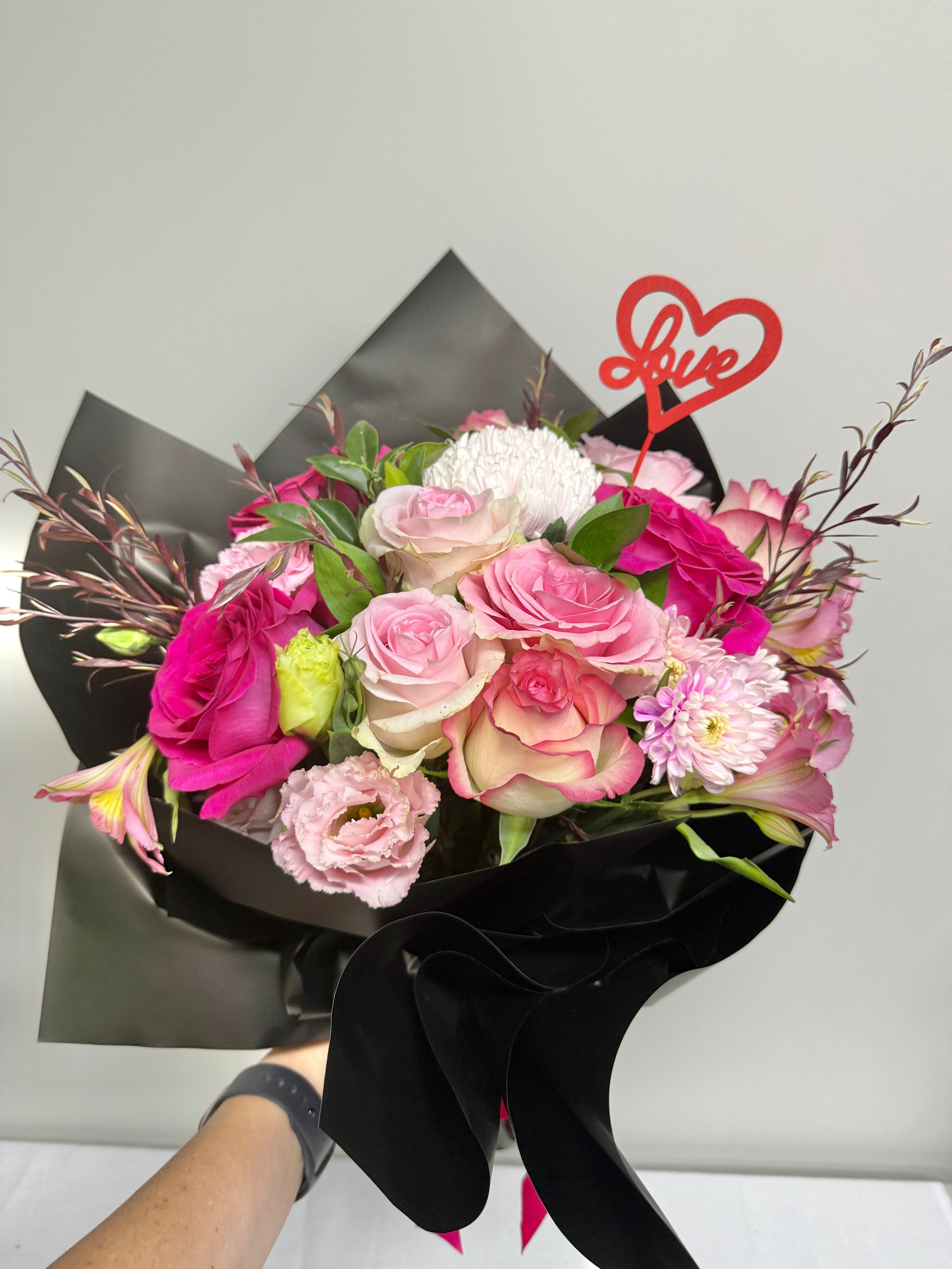 With a combination of selected pink roses, Alstro, Lizzies, Carnations and Daisy Chrysanthemums wrapped beautifully with a Red Love timber keepsake - you can't go wrong with this bouquet on Valentines day!